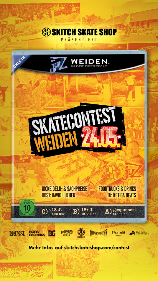 We’re excited to invite you to the 4th Annual Weiden Skate Competition on May 24th at JUZ Weiden! The event will take place at Frühlingstraße 1, 92637 Weiden in der Oberpfalz.